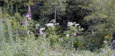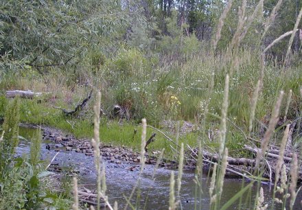 For a change, we decided to walk first along the trail toward Pineview and the ever promised, never present observation platform. We were pleased to see a Sandhill Crane in a nearby field and Osprey on the two platforms. From the trail, we approached the creek for a possible photo of Monkey Flowers, and instead spooked an Eastern Kingbird and three spotted sandpipers. |
